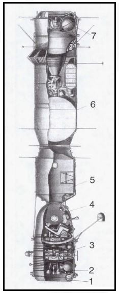 Le vaisseau 7K était un véhicule à trois modules de 7,7 mètres de long : Le compartiment cylindrique des agrégats pour instruments, l'appareil de descente en forme de phare, le compartiment d'habitation cylindrique.