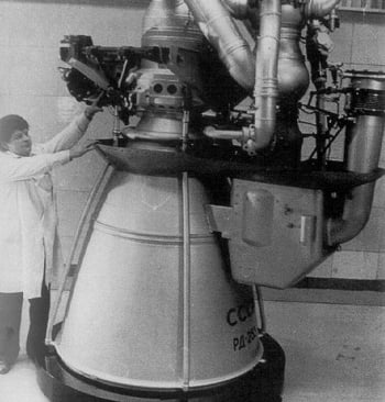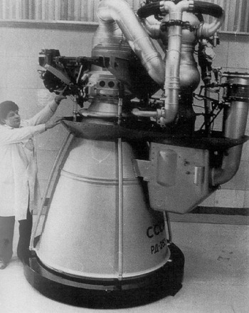 Chelomey étaient principalement dues au choix du schéma de cycle fermé, qui permettrait de dériver des pressions de chambre extrêmement élevées sans pertes d'impulsion spécifique, augmentant ainsi considérablement les performances. Glushko a résolu ce problème en installant des turbines pour faire fonctionner les pompes à carburant à l'intérieur de la chambre de combustion du générateur de gaz. Pendant la mise à feu, la chambre recevrait la quantité totale de comburant, mais seulement une partie du carburant. Ce mélange brûlerait alors dans la chambre de combustion préliminaire à une température relativement basse, entraînant ainsi la turbine. Plus tard, le gaz de combustion entrerait dans la chambre de combustion principale du moteur, où le carburant restant serait ajouté. La réaction résultante provoquerait une combustion totale des composants propulseurs. Avec cette disposition, la puissance utilisée pour entraîner les turbines pourrait être réduite à des niveaux très faibles, tandis que la pression de combustion serait considérablement augmentée sans pertes de propulsion. Enfin, les oscillations de combustion redoutées par Glushko seraient éliminées en raison des températures de combustion extrêmement élevées. Pour la technologie de conception des moteurs soviétiques, ce serait une avancée significative. Chelomey, toujours extrêmement ambitieux, avait été séduit par l'idée et avait misé sur elle.