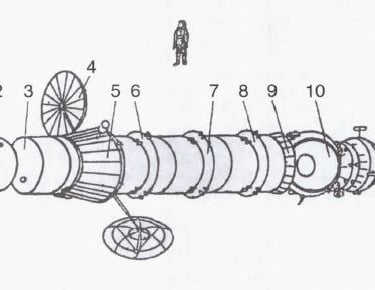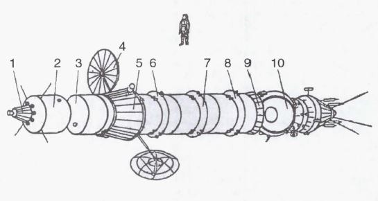 Modèle du complexe L1 en 1962. Première ébauche du projet Soyouz de 1961 consistait en une modernisation de la série Vostok 3KA (Vostok-Zh). Trois étages de fusée seraient assemblés en orbite terrestre basse. (1) section avant du vaisseau spatial 1L ; (2) compartiment de vie 1L ; (3) Appareil de descente 1L ; (4) panneau solaire ; (5) compartiment à instruments 1L; (6, 7 et 8) trois modules de propulsion « bloc fusée » ; (9) section largable de l'étage final de la fusée ; (10) vaisseau spatial Vostok-7. (co-droit d'auteur Igor Afanasyev)