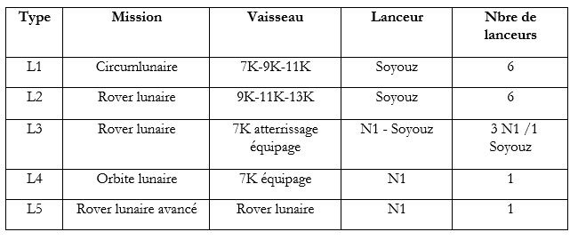 accompliraient réellement l'atterrissage sur la Lune. Le thème L4 avait pour objectif de mener des missions orbitales lunaires pilotées à l'aide d'un vaisseau spatial Soyouz modifié avec un étage permettant le retour. Le principal objectif du thème L5 développait des missions itinérantes avancées sur la Lune ; les cosmonautes pourraient utiliser ces gros rover de cinq tonnes et demie pour parcourir de longues distances sur la surface de la lune.