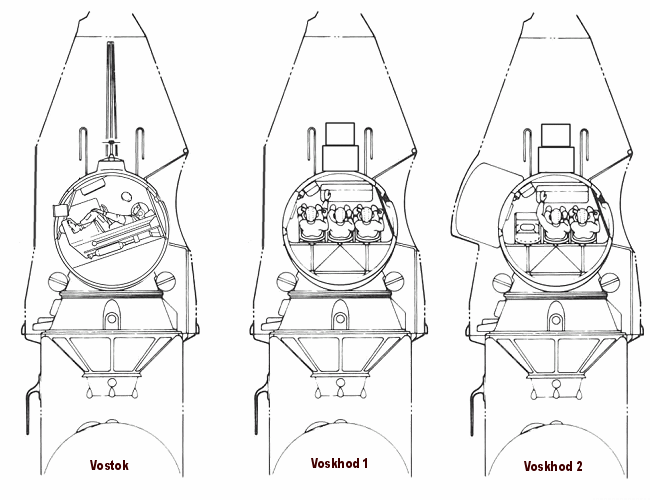 Feoktistov a proposé de retirer le siège éjectable et les combinaisons spatiales des cosmonautes pour libérer de la place et permettre aux trois hommes de s’entasser dans le vaisseau en vêtements normaux. Cette proposition a provoqué de nombreuses discussions entre médecins et ingénieurs, mais ce choix était tout simplement obligatoire, il était impossible de mettre trois hommes en combinaison pressurisée dans un espace aussi étroit. Feoktistov n’a pu s’empêcher de dire : « ce ne seront plus des cosmonautes, mais des sardines ! ». La suppression du siège éjectable a réduit singulièrement la sécurité pour le lancement et l’atterrissage. En cas d’échec du lancement, aucun des trois cosmonautes ne pourrait s’éjecter du vaisseau, de même à l’atterrissage. Korolev a résolu le problème de la sécurité au lancement en demandant à Ivan I. Kartukov de l’OKB-2 d’accélérer le développement du système d’évacuation par fusée en cours de développement pour le programme Soyouz. Pour l’atterrissage, il a proposé l’utilisation d’un système de parachute à trois niveaux couplé avec des moteurs fusés pour réduire la vitesse au moment de l’atterrissage.