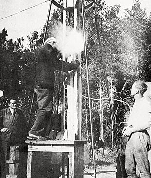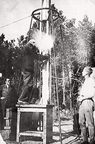 L'équipe GIRD en 1933, alimentant l'oxygène au '09', le premier propulseur liquide soviétique. De gauche à droite Sergey Korolev, Nikolaï Efremov et Youri Pobedonostsev.