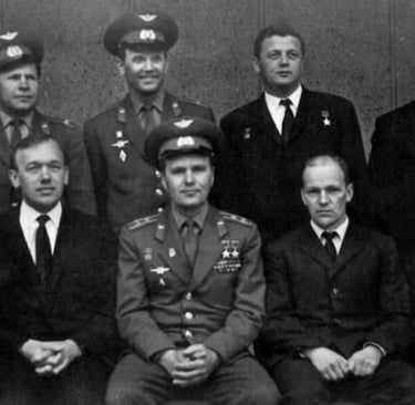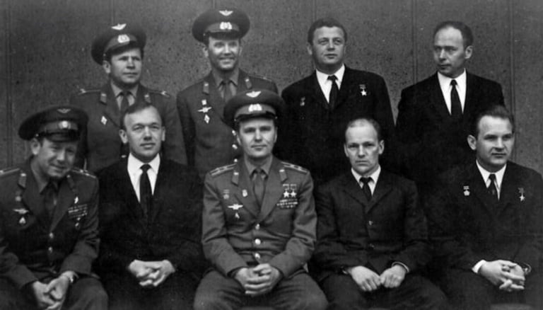 Les cosmonautes du DOS, assis : Leonov(gauche), Yeliseyev, Shatalov, Rukavishnikov et Kubasov, debout : Kolodine (gauche), Dobrovolskiy, Volkov et Patsayev