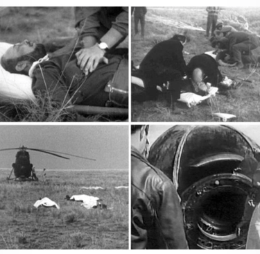 Drame sur le site d'atterrissage. En haut à gauche : Des médecins tentent de réanimer Dobrovolskiy. En haut à droite : Des médecins s'occupent de Patsayev (au premier plan) et de Volkov (au milieu). En bas à gauche : Après avoir reconnu la mort des cosmonautes, leurs corps ont été enveloppés dans des couvertures blanches. En bas à droite : Des spécialistes commencent l'inspection du module de descente.