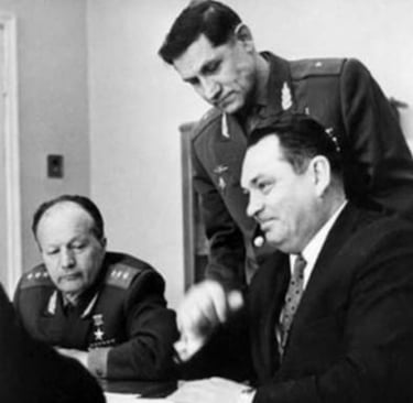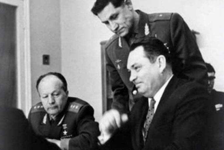 Après que Kubasov ait été cloué au sol par les médecins, Kamanin et Mishin (au premier plan) et Kuznetsov (debout) discutent pour savoir qui devrait piloter la mission.