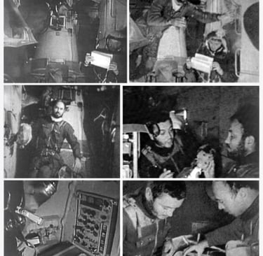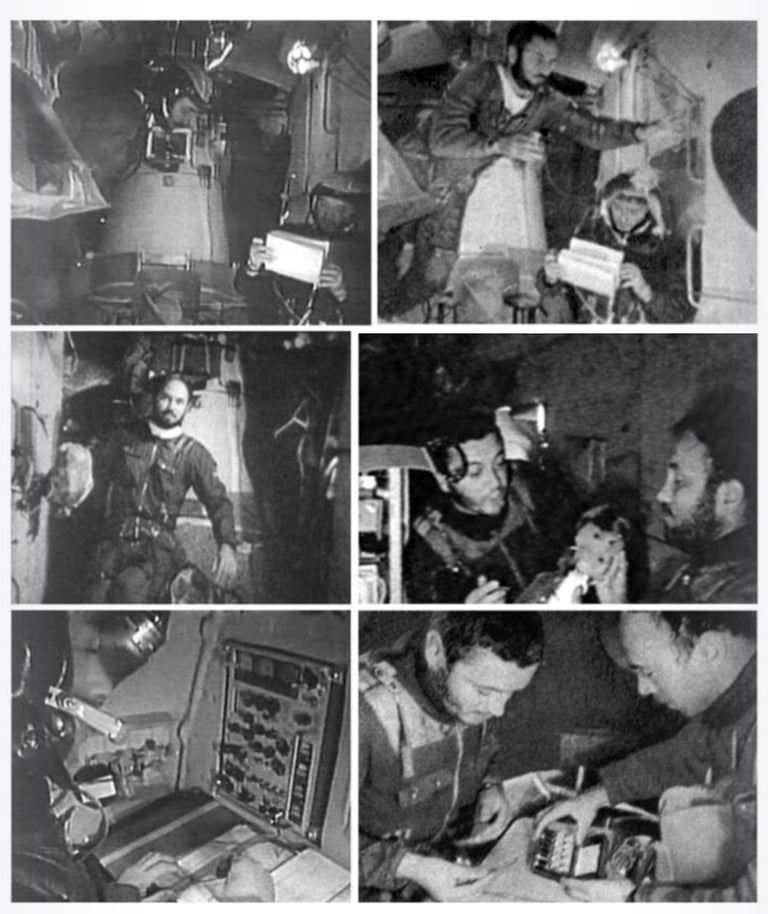 La vie à bord de Saliout. Sur les deux photos du haut, Dobrovolskiy et Volkov sont dans le compartiment de travail, vêtus de leurs combinaisons . Dobrovolskiy se détend (au milieu à gauche) après l'incendie à bord de la station. Dobrovolskiy (à droite) et Volkov discutent du programme de vol (au milieu à droite). Ils étaient parfois en conflit sur la meilleure façon de procéder. On peut voir Patsayev travailler avec le télescope Orion (en bas à gauche) et avec Volkov prélever des échantillons de sang .