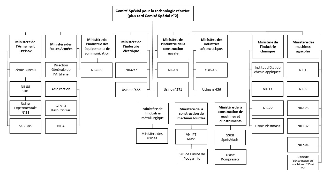 Chaque Ministère concerné de près ou de loin par les fusées devait créer en son sein une Direction chargée de ces activités. Le ministère de l’Armement, principal intéressé, a créé sa 7ème Direction Principale en nommant à sa tête Sergueï Vetoshkin. Le Comité Spécial des Techniques à Réaction était chargé de superviser les activités relatives aux fusées, et le point n°5 fixait comme priorité « la reproduction, avec des moyens nationaux, d'une fusée du type du V-2 ». Le document réclamait la création d'un polygone de tir, qui deviendrait la base de Kapustin Yar, futur cosmodrome russe. Ustinov décida de créer un nouvel institut de recherche appliquée rassemblant les ingénieurs et techniciens travaillant sur le sujet. L'Institut de recherches NII-88 a été créé le 13 mai 1946 à Podlipki (aujourd’hui Kaliningrad) dans la banlieue nord-est de Moscou et a été installé dans les locaux de l'usine de canons n°88 dans laquelle était fabriqué munitions et blindés pendant la guerre. Cette usine avait été créée en 1866 à Léningrad, avant d’être transférée à Moscou en 1920. Elle avait été évacuée à Perm dans l’Oural de 1941 à 1943. L'institut NII-88 a été rattaché à la 7e direction générale au sein du ministère des Armements et son premier responsable était Lev Gonor, son adjoint l’ingénieur principal A. S. Spiridinov, tous les deux anciens directeurs d’usines d’artillerie. Le chef de bureau d’étude central était K. I. Tritko. Ce bureau était divisé en plusieurs sections de fusées balistiques et zénithales, ainsi que des moteurs fusés à liquide et à poudre. L’institut devait coordonner l’activité des instituts qui travaillaient sur la technique des fusées. Le 13 mai 1946, l’institut de balistique et d’artillerie a été créé, le NII-4, sous la direction du lieutenant-général d’artillerie Aleksey I. Nesterenko, qui commandait les unités de Katioucha pendant la guerre. Son adjoint était le colonel Tikhonravov, ancien chef de brigade du GIRD et chef de secteur du RNII. Le NII-4 était chargé entre autres de la création des moyens de trajectographie et de télémesure, et de proposer un site à partir duquel les A-4 et autres missiles pourraient être testés.