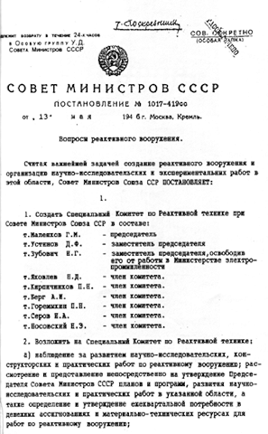 A l’issue du court voyage en Allemagne, la commission Yakovlev a préparé un décret sur les "Questions d'armement à réaction", le décret n°1017-419ss qui allait marquer l’histoire des programmes spatiaux soviétique. Staline et les généraux d’infanterie avaient bien compris que les forces d’infanterie soviétique en Europe ne seraient qu’un facteur de dissuasion temporaire. Les Soviétiques devaient rattraper et distancer les Américains dans la technologie des armes nucléaires, et compte tenu du retard observé dans la technologie aéronautique, il fallait rapidement développer de nouveaux types d’armements, et en premier lieu des missiles. Staline a signé officiellement ce décret le 13 mai 1946, soit un an après la fin de la guerre, et a lancé ainsi l’ère de la technologie des missiles russes. Ce décret jetait les bases de la création de toute l’infrastructure de l’industrie des fusées de l’URSS, des plus grandes agences d'État aux organisations et entreprises de recherche scientifique, de conception et de production, en passant par les unités militaires qui testeraient et utiliseraient ces armes.