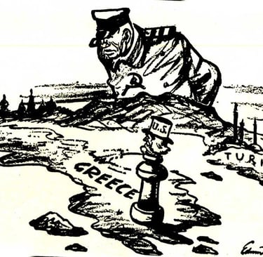 Cette caricature politique montre l'expansion du communisme par les Soviétiques (ici Staline) sur la Turquie et la Grèce, et les États-Unis sont représentés comme les protecteurs.