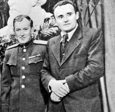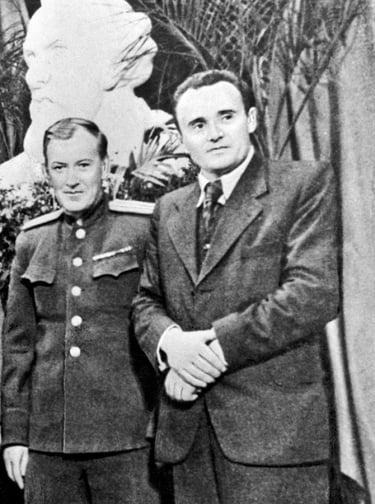 Tikhonravov et Korolev à la cérémonie du 90ème anniversaire de Tsiolkovsky le 17 septembre 1947