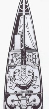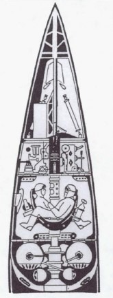 Un dessin du VR-190, première conception d'un vaisseau spatial piloté. Conçu par Mikhaïl Tikhonravov au NII-1 en 1945, le VR-190 transporterait deux "stratonautes" attaché en position verticale pour un vol de 200 kilomètres dans l'atmosphère.