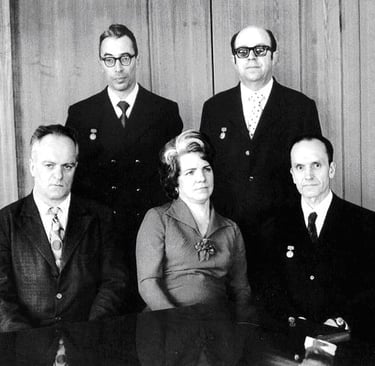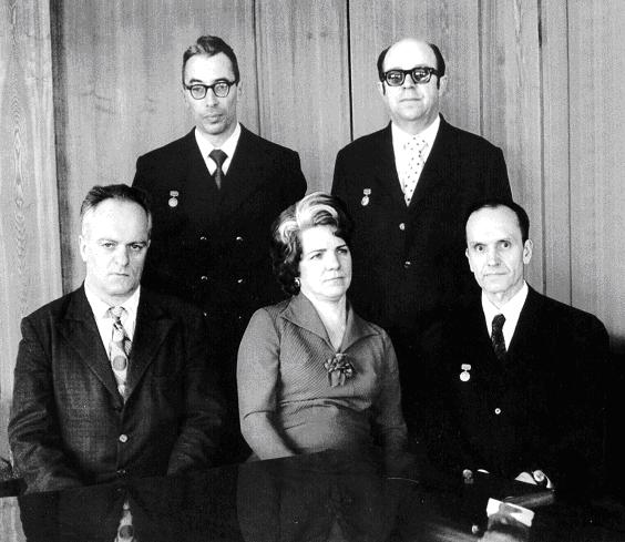 Le groupe Tikhonravov en 1949 : assis de gauche à droite : Yan Ivanovich Koltunov , Lidiya Nikolaevna Soldatova, Yatsunsky Igor Marianovich Yatsunsky, debout : Gleb Yurievich Maksimov, Anatoly Viktorovich Brykov