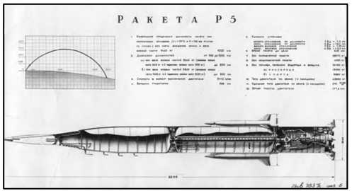 Le missile R-5 incorporait tout de même de nombreuses caractéristiques de conception prévues pour le R-3. Ainsi, les ingénieurs ont développé un nouvel ensemble de servomoteurs de fonctionnement plus rapides pour les petits gouvernails aérodynamiques afin de compenser la réduction de la taille des ailettes de stabilisation principales. Le système de guidage du missile, développé au NII-885 sous la direction du concepteur en chef Pilyugin, utilisait des intégrateurs d'accélération longitudinale, ce qui permettait d'améliorer la précision du temps de coupure du moteur, améliorant ainsi la précision du ciblage. Une équipe du NII-88 a développé un blindage thermique spécial pour l'ogive, qui devait rentrer dans les couches supérieures de l'atmosphère à une vitesse de 3 000 mètres par seconde, bien au-dessus de tout ce qui avait été construit auparavant. Les réservoirs du propulseur faisaient partie intégrante du châssis du missile, la fusée avait donc une apparence nettement différente de celle des R-1 et R-2. La masse nominale était réduite d’une tonne par rapport au R-2. Le rapport propulseur/masse était ainsi augmenté de 4,2 à 6,6. L'unité de propulsion du R-5 était le nouveau moteur RD-103, une variante modifiée du RD-101 utilisé sur le R-2. Développé par OKB-456 de Glushko, ce nouveau moteur à chambre unique avait une poussée sous vide de cinquante et une tonnes, soit une augmentation de 60 pour cent par rapport au modèle précédent ! Les performances étaient au maximum des possibilités de réalisation soviétique avec un mélange utilisant du LOX et de l'alcool. Contrairement aux véhicules R-1 et R-2, le R-5 avait un cadre complètement cylindrique et un rapport hauteur/largeur élevé de 12,5 (contre 10,7 pour le R-2). L’ensemble de ces facteurs contribuaient à des améliorations significatives de la portée du missile, malgré une taille globale similaire. Le R-5 mesurait 20,74 mètres de long et 1,66 mètre de diamètre de base. La masse totale au décollage était de 28,57 tonnes. Les exigences initiales précisaient que le missile devait pouvoir transporter un explosif d'une tonne sur une distance de 1 200 kilomètres.