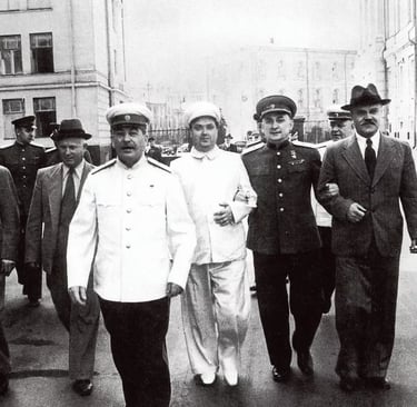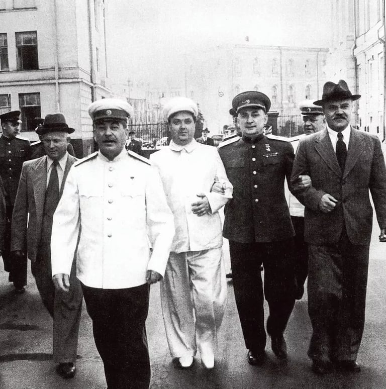 La garde rapprochée de Staline : de gauche à droite: Nikita Khrouchtchev, Josef Staline, Gueorgui Malenkov, Lavrenty Beria et Viatcheslav Molotov