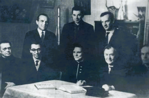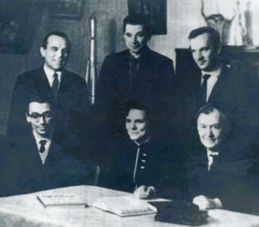 Assis, de gauche à droite : Galkovsky, Maximov, Soldatova,Tikhonravov, Yatsounsky, debout : Moskalenko, Gourko, Bajinov.