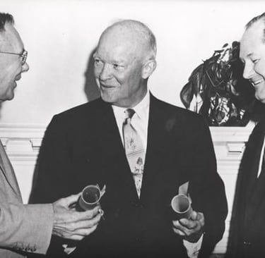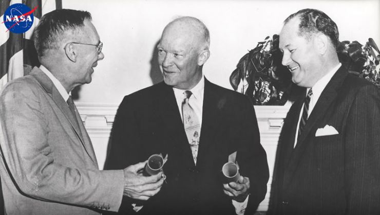 Au centre, le Président Dwight D. Eisenhower avec T. Keith Glennan (à droite) premier administrateur et Hugh L. Dryden (à gauche) administrateur adjoint, Crédit photo : NASA