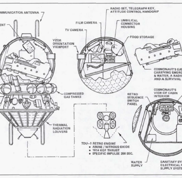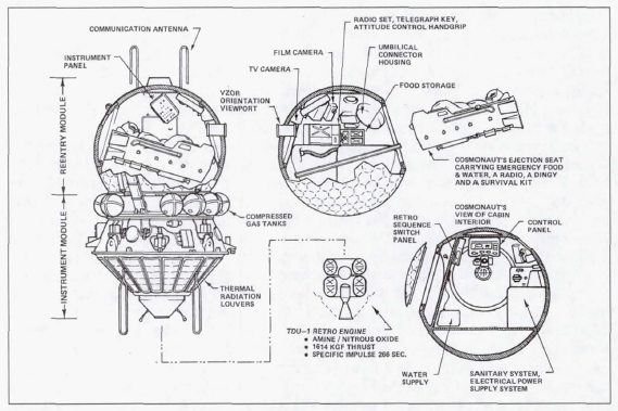 Variante pilotée du vaisseau spatial Object K qui fut plus tard appelé Vostok. Le navire Vostok était composé de deux modules de base : un module de rentrée sphérique (« appareil de descente ») pour le lancement et la récupération du pilote et un module d'instruments ("section instrument") pour transporter les systèmes nécessaires au vol. (droit d'auteur David R. Woods)