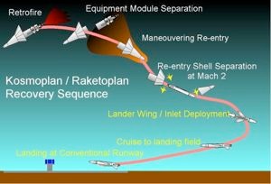 rentrée dans l’atmosphère terrestre, un cône apparaîtrait, comme un parapluie plié, puis s'étendrait hors du véhicule. Après la rentrée atmosphérique à une vitesse de Mach 2, le Kosmoplan larguerait le « parapluie » et l'avion atterrirait finalement sur une piste d'atterrissage d'aéroport. Le Kosmoplan pourrait aussi être utilisé pour des missions militaires de reconnaissance, proche de la terre, à des altitudes de quatre-vingt-cinq à 105 kilomètres.