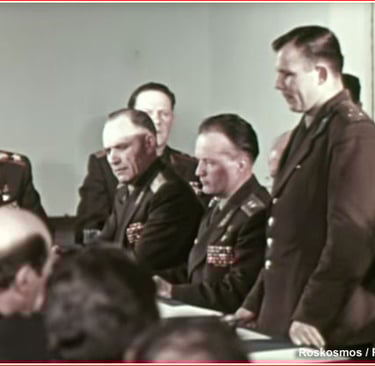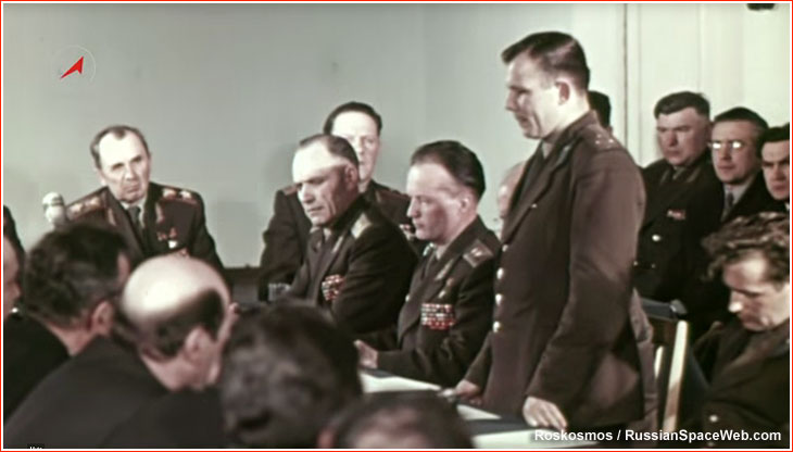 Youri Gagarine (debout) rend officiellement compte à la Commission d'État de son état de préparation pour le vol. Kamanine est à gauche de Gagarine, Titov (assis, la tête baissée est à droite.
