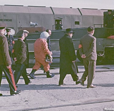 Gagarine a passé deux jours à la maison de campagne de la direction du parti local près de Kuibyshev, tandis que Moscou se préparait à son arrivée triomphale. Le 14 avril 1961, il s’est envolé de Kuibyshev pour Moscou. Alors que l’avion approchait de la ville, un groupe d’avions de chasse lui a fourni une escorte. Sur le tarmac, Nikita Khrouchtchev, Léonid Brejnev et la plupart des responsables, accompagné d’une foule de spectateurs en liesse, ont regardé Gagarine vêtue de son uniforme de l’armée de l’air sortir de l’avion et marcher sur le tapis rouge pour être accueilli en héros par le dirigeant soviétique.