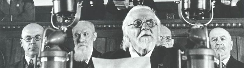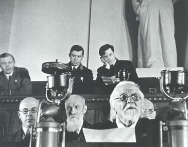 Le président de l'Académie des sciences de l'URSS, Alexandre Karpinski, salue les délégués du 10e Congrès du Komsomol